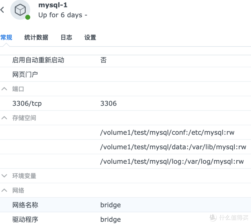 根据前面的教程,我们在 Container Manager 中新建了一个 MySQL 数据库,端口为3306,网络模式为 bridge。