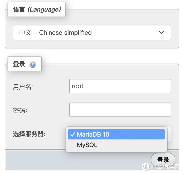 在 phpMyAdmin 登录界面,输入用户名:root,密码为前面安装 MariaDB 设置的密码,就能登录到 MariaDB 服务