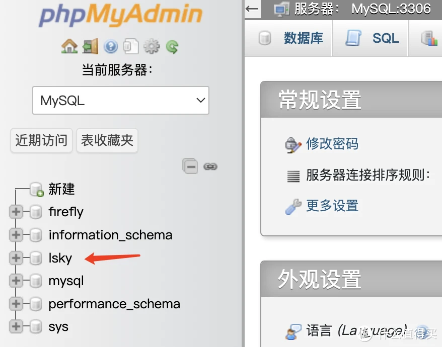 选择 MySQL 后,输入在创建容器时配置的 root 密码,可以看到名为 lsky 的数据库