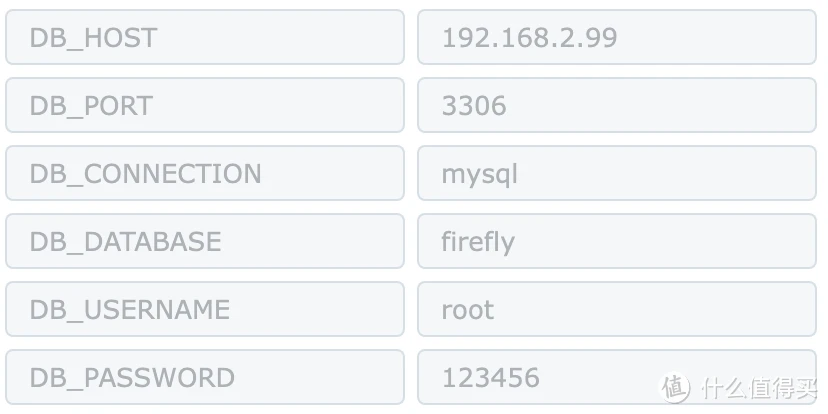 在配置容器时,我们只需要手动设置 DB_HOST、DB_PORT、DB_USERNAME、DB_PASSWORD 为已安装的 MySQL 服务器,再输入一个数据库名 firefly。