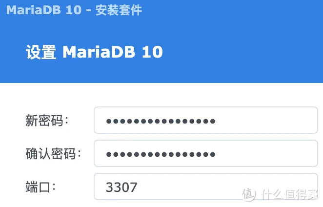 MariaDB 安装方法非常简单。在套件中心搜索 MariaDB,点击安装按钮后,再输入密码和端口(3306被服务端口占用了)等待安装完毕即可。
