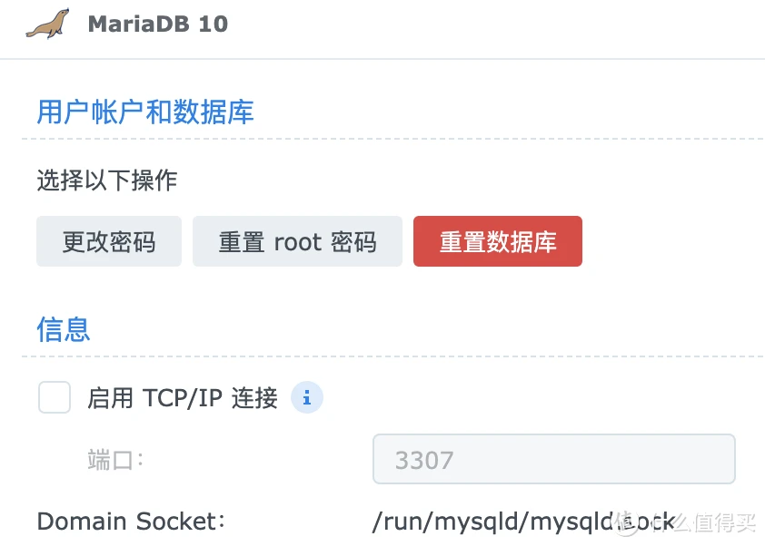 这也就解释了前面在 MariaDB 套件中没有启用 TCP/IP 也能使用 phpMyAdmin 连接到 MariaDB 的原因,而使用 socket 连接数据库是不需要指定端口号的,所以在 MariaDB 中设置的端口号是为了使用 TCP/IP 连接。